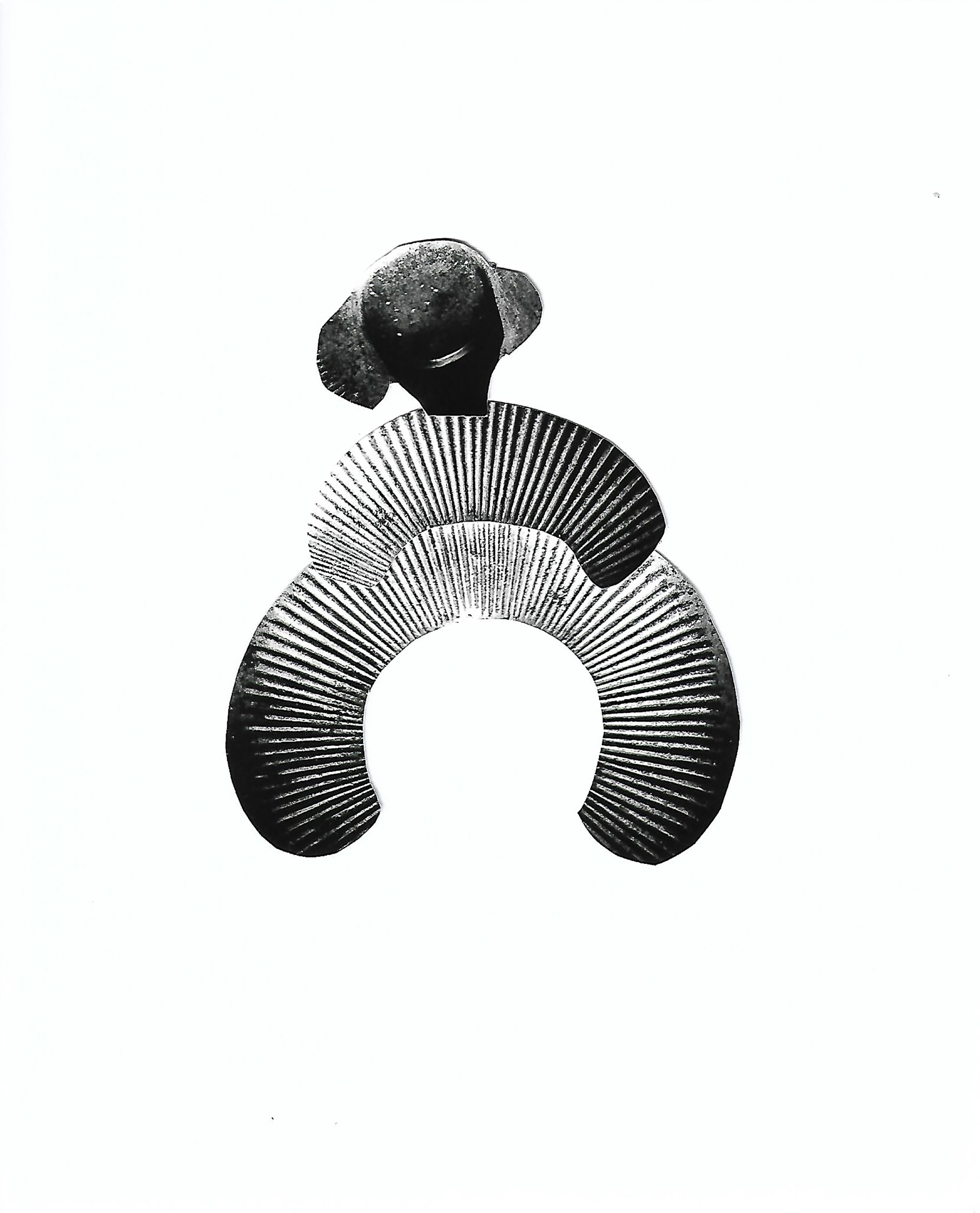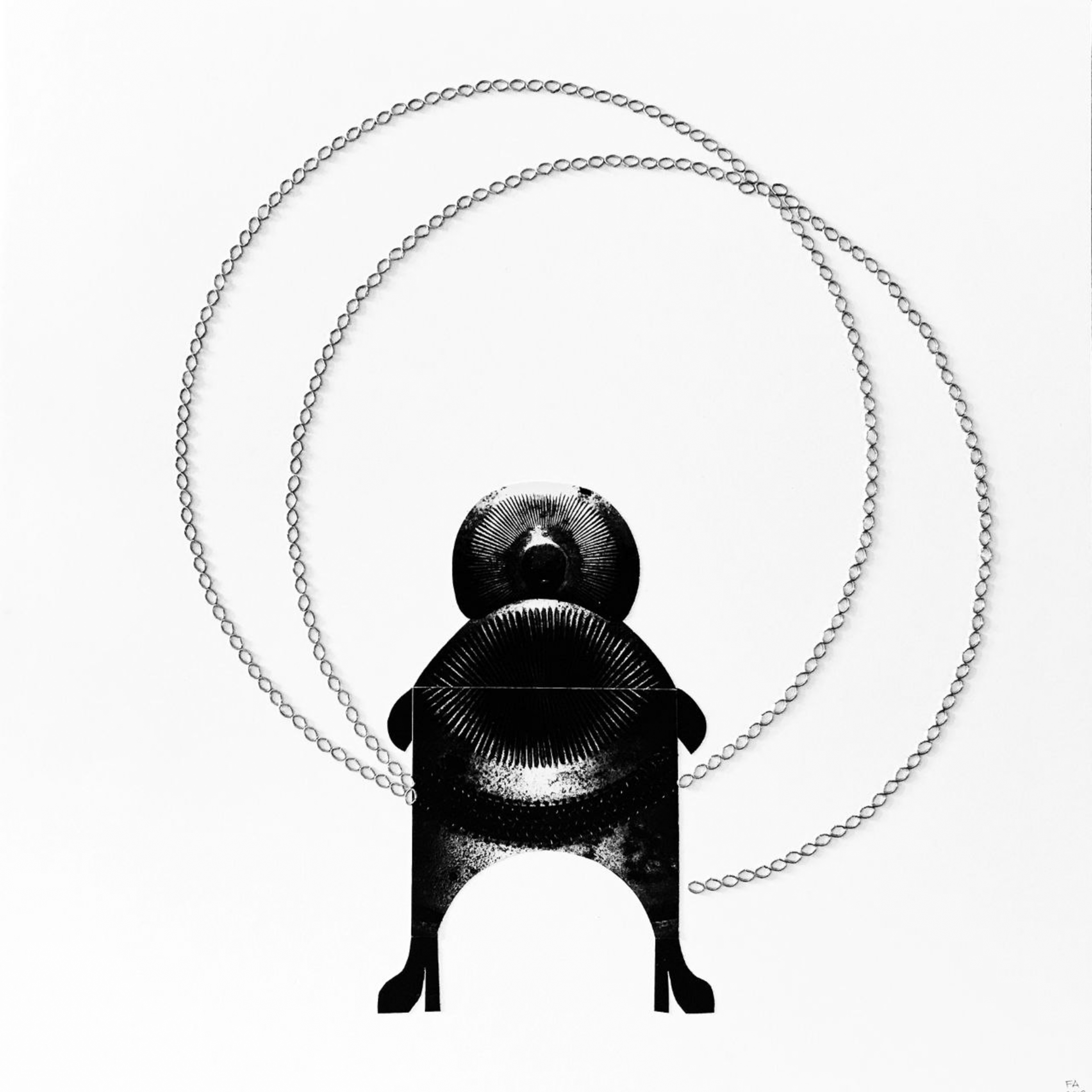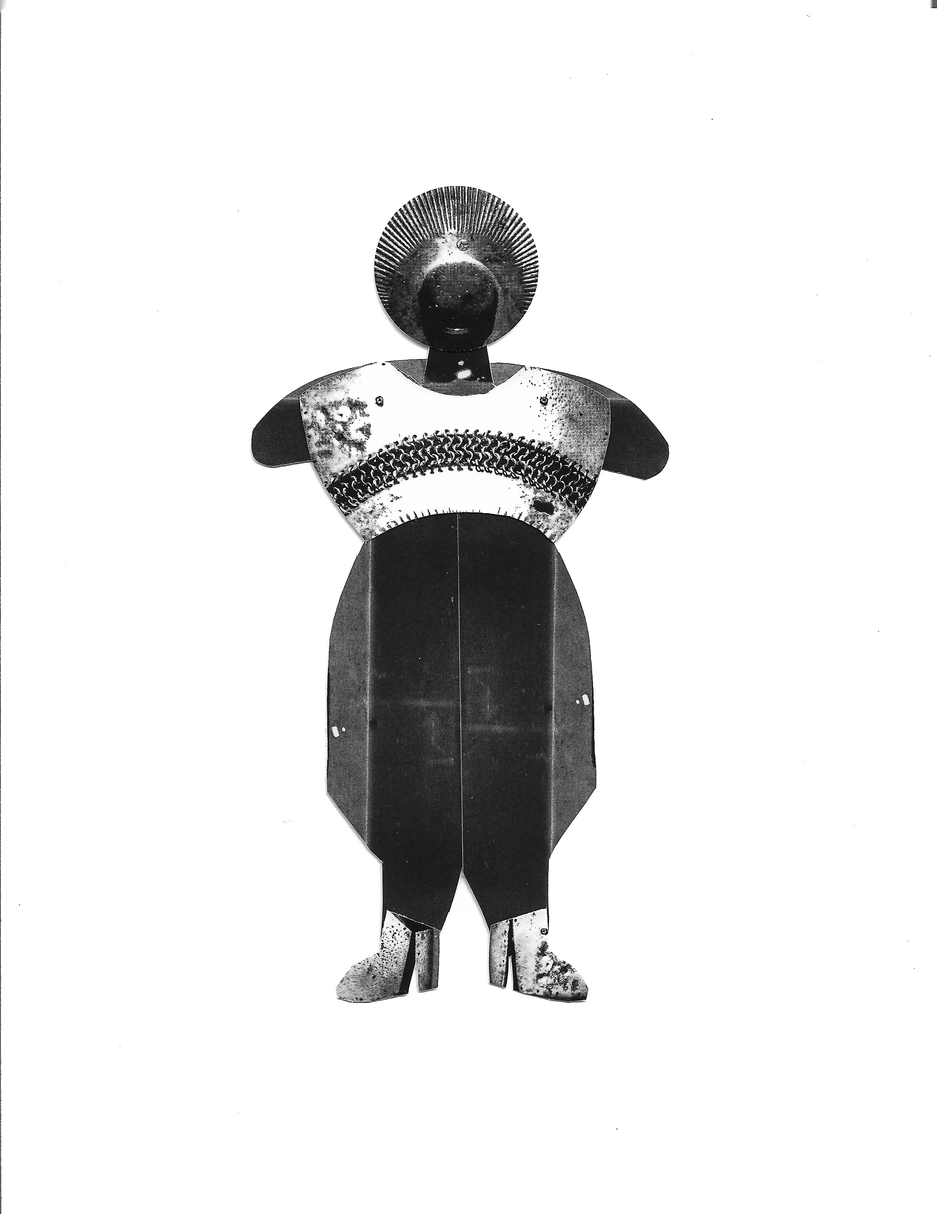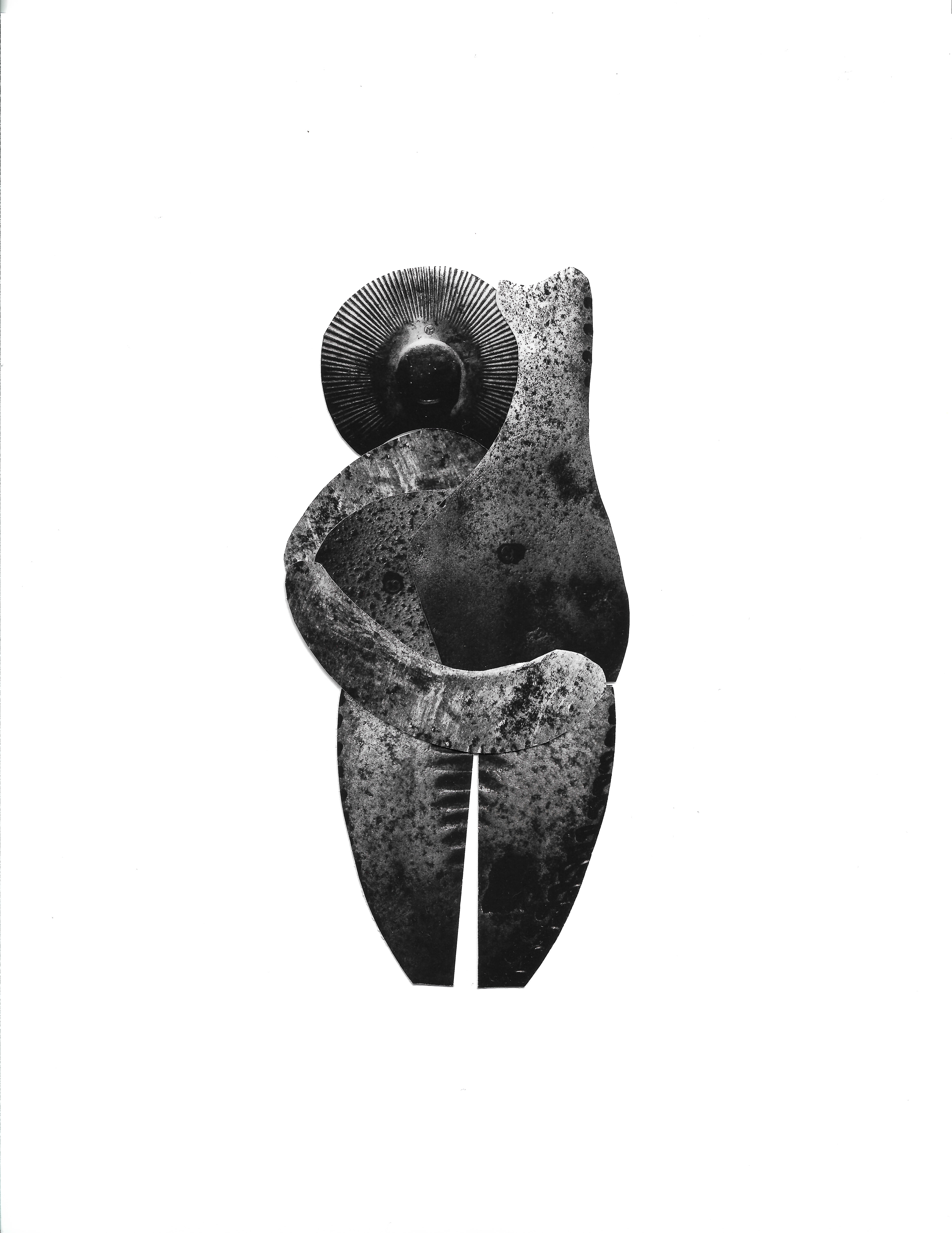 Uno de los resultados de esas búsquedas fue la interpretación y la reunión de 100 imágenes que tienen como base la fotografía abstracta, el recorte y la unión de piezas que juegan con la forma y con las texturas. La artista partió de la fotografía del detalle de un vestigio metálico de protección, expuesto en un museo, y lo trasladó por la vía digital a escala de grises, amplió algunos rasgos, jugó con el efecto espejo, imprimió en serie y a través de un trabajo totalmente manual de recortar, crear piezas geométricas y unirlas llegó a conformar esta serie de pequeñas efigies llenas de gracia y movimiento, cuyas redondeces nos remiten a las figuras femeninas del pasado paleolítico y cuyas texturas hacen pensar en las calles de las grandes ciudades.